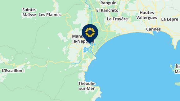 itinéraireAutoroute A8, sortie 40 "Mandelieu". En sortant de l'autoroute, suivre la direction Cannes-Grasse. Passer le feu (face à la station service) et en arrivant au rond-point, prendre la direction de Grasse (Avenue des Anciens Combattants). Longer la salle des sports et le stade sur votre droite. Au feu, l'entrée de la résidence est à gauche. Composez le code pour la barrière, et aller à gauche, parcourir presque 1 km sur cette route. L'accueil se trouve sur votre droite au 1er virage, entre le salon de coiffure et l'esthéticienne.