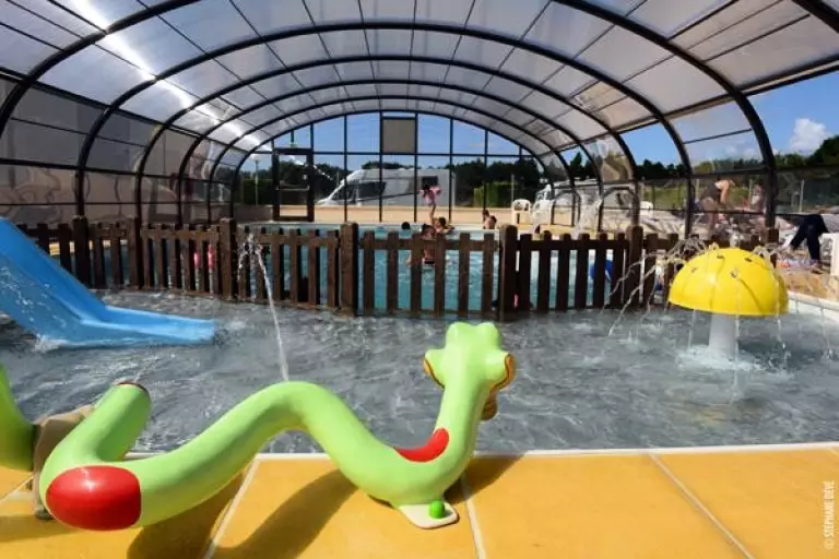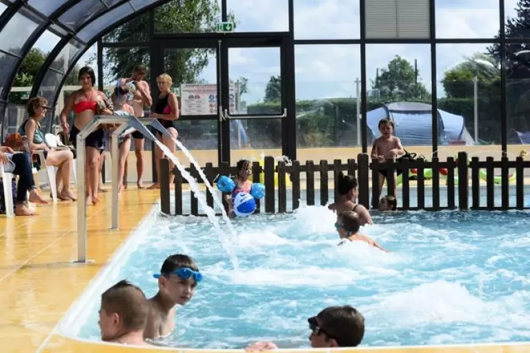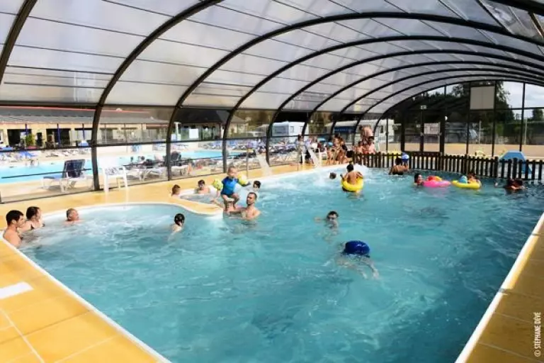 2 zwembaden: 1 buitenverwarmd van juni tot september van 144 m2 en een tweede zwembad van 105 m2 overdekt en verwarmd met aqualudische ruimte voor kinderen, geopend vanaf de opening tot de sluiting van de camping.