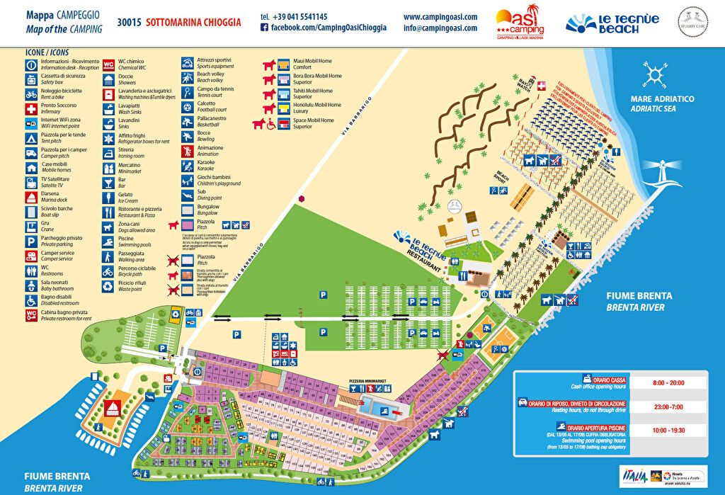 De Camping Oasi met een ruim en uitgerust privéstrand is voorzien van alle comfort en heeft een bar, broodjeszaak, restaurant, beachvolleybalvelden, tennisbanen en voetbalvelde. Twee zwembaden en een aanlegsteiger om aan te meren.